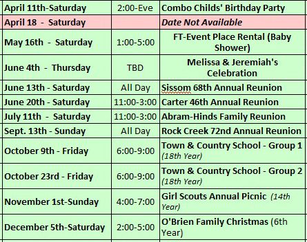 Reserved Groups are shown in these calendar pages. Typical times are Fridays 6:00-9:00 (up until 7:00-10:00) Saturdays 5:00-8:00 up to 7:00-10:00, Sundays 3:00-6:00 up to 7:00-10:00