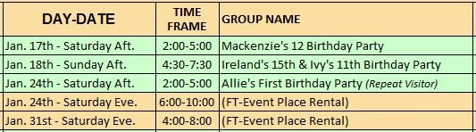 We offer our venue exclusively to your group based on a three hour time frame - beginning at 6:00 going up to 10:00 on Friday Evenings, 5:00 until at late as 10:00 on Saturday evenings and late Sunday afternoons or evenings. In addition to a three hour time frame, we offer a free hour to set-up for one or two to decorate and set up before the event start time. Extra time can be purchased for $100 per hour. Please refer to our main website, fireytrails.com/calendar to see our calendar. (But a screenshot of the same calendar is represented to your left.) More and more, around half of our calendar are repeat perennial groups. (We even occasionally schedule repeat BIRTHDAY PARTIES.)